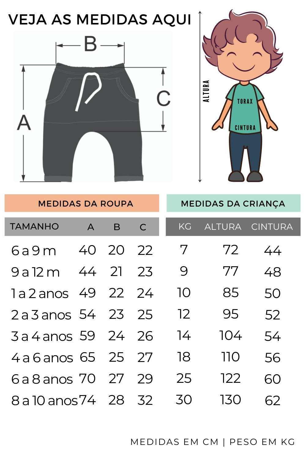 Para você ter uma compra de sucesso, é importante que você compare as medidas da tabela abaixo com as medidas do corpo da criança. Assim a chance de precisar fazer uma troca são mínimas e você ficará muito mais satisfeita com a nova Calça Saruel do seu filho ou filha!