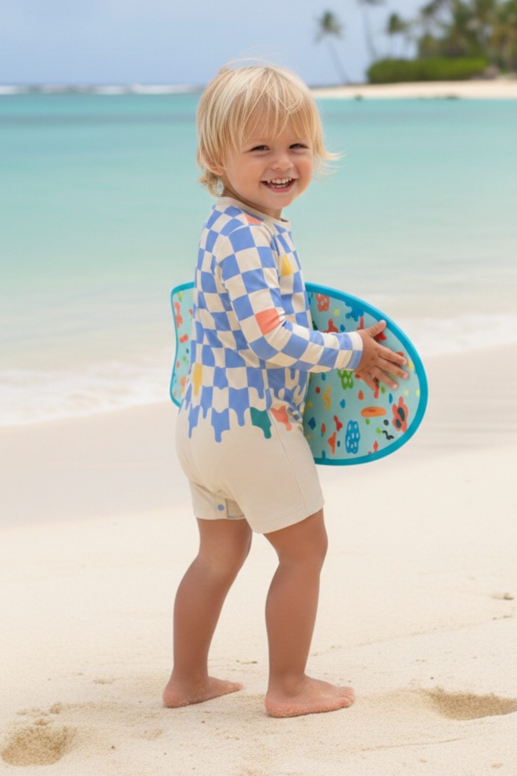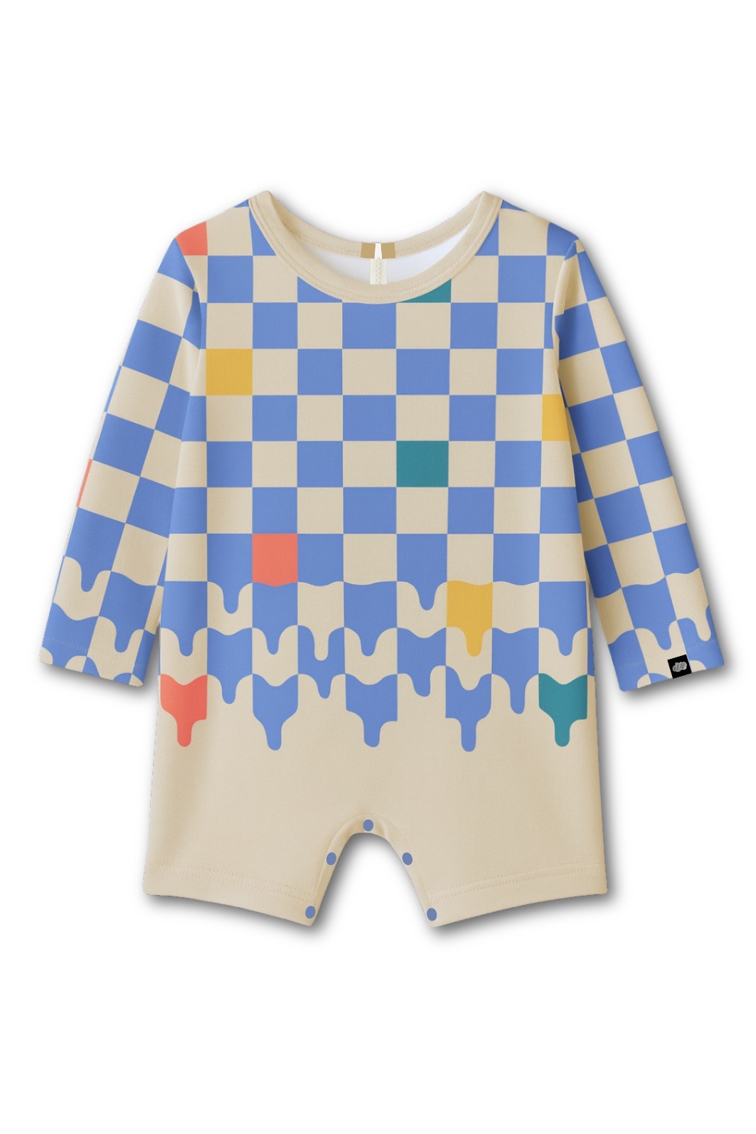 O tecido é leve, respirável e com toque fresco, ajudando a manter a temperatura corporal equilibrada mesmo em dias quentes. A manga longa cria uma barreira física contra o sol, o vento e o atrito com a areia, protegendo a pele do bebê sem aquecer ou limitar os movimentos.