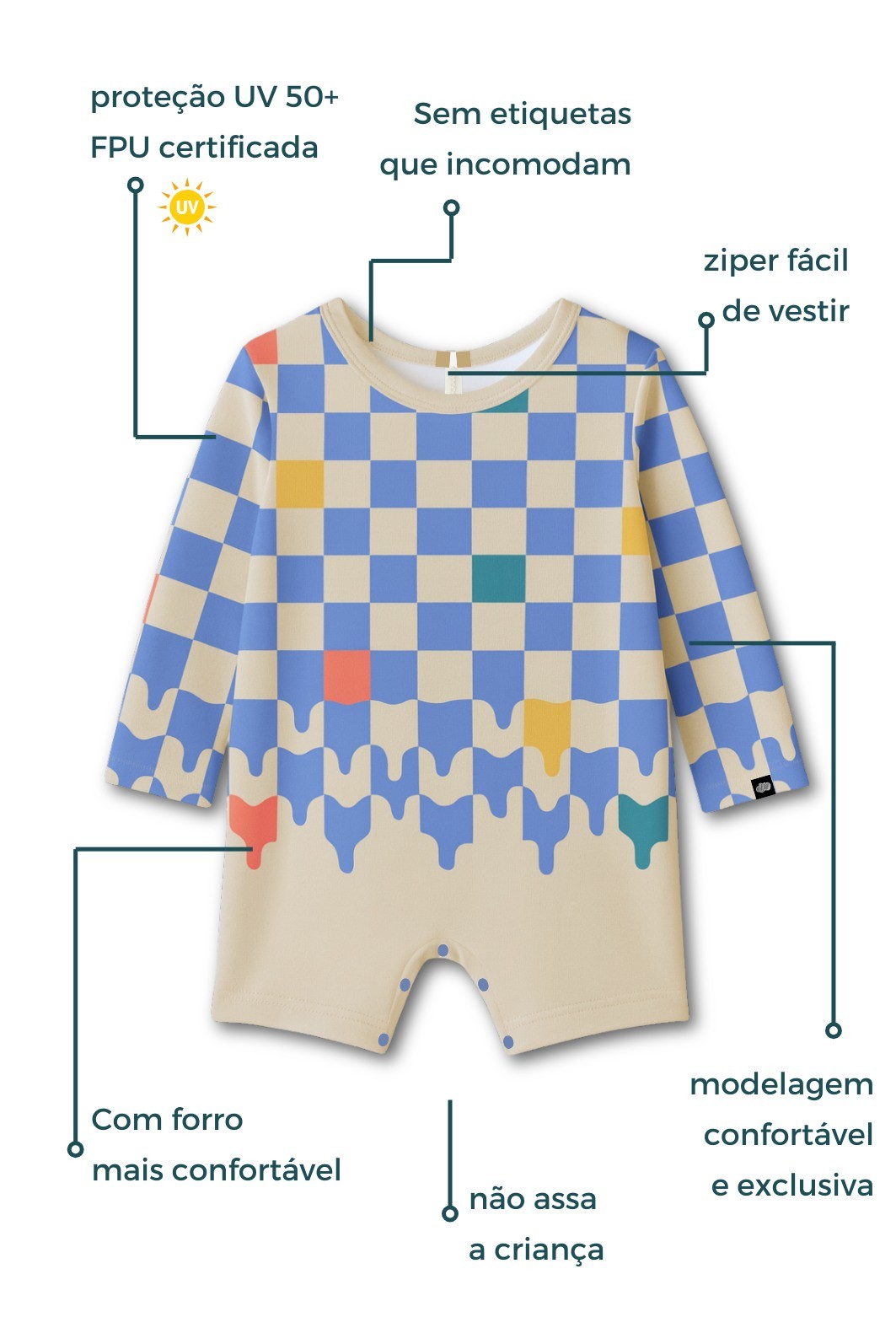 O macacão praia bebê com proteção solar UV 50+ foi desenvolvido com tecnologia capaz de bloquear até 98 por cento dos raios UVA e UVB. Essa proteção é permanente, não sai nas lavagens e está incorporada diretamente ao fio do tecido. Ou seja, ela continua funcionando uso após uso, sem perder a eficiência.