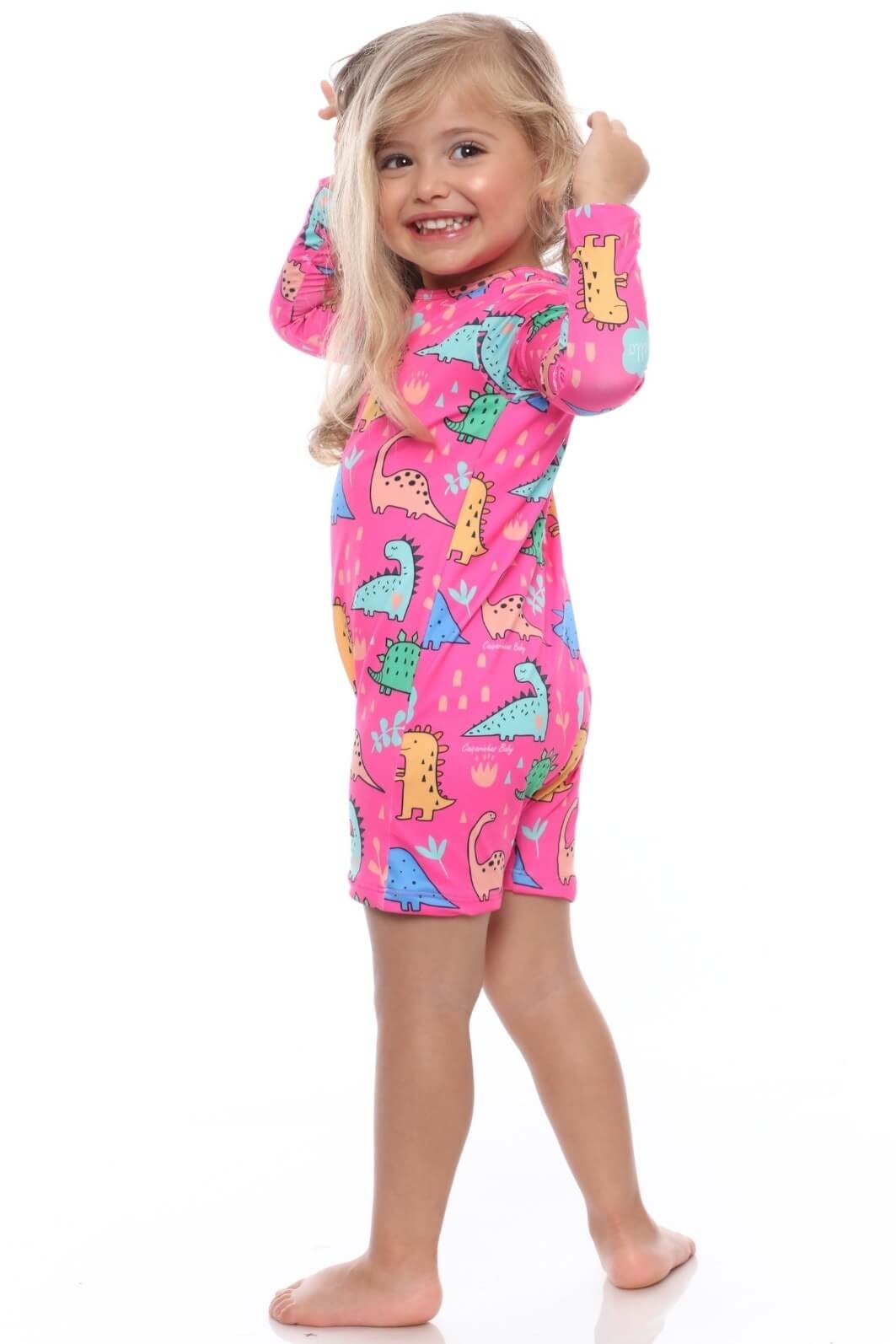 O Macacão Praia Bebê Proteção Solar UV 50+ Manga Longa Rosa Dino é para quem quer resolver uma preocupação real com uma única escolha bem feita.