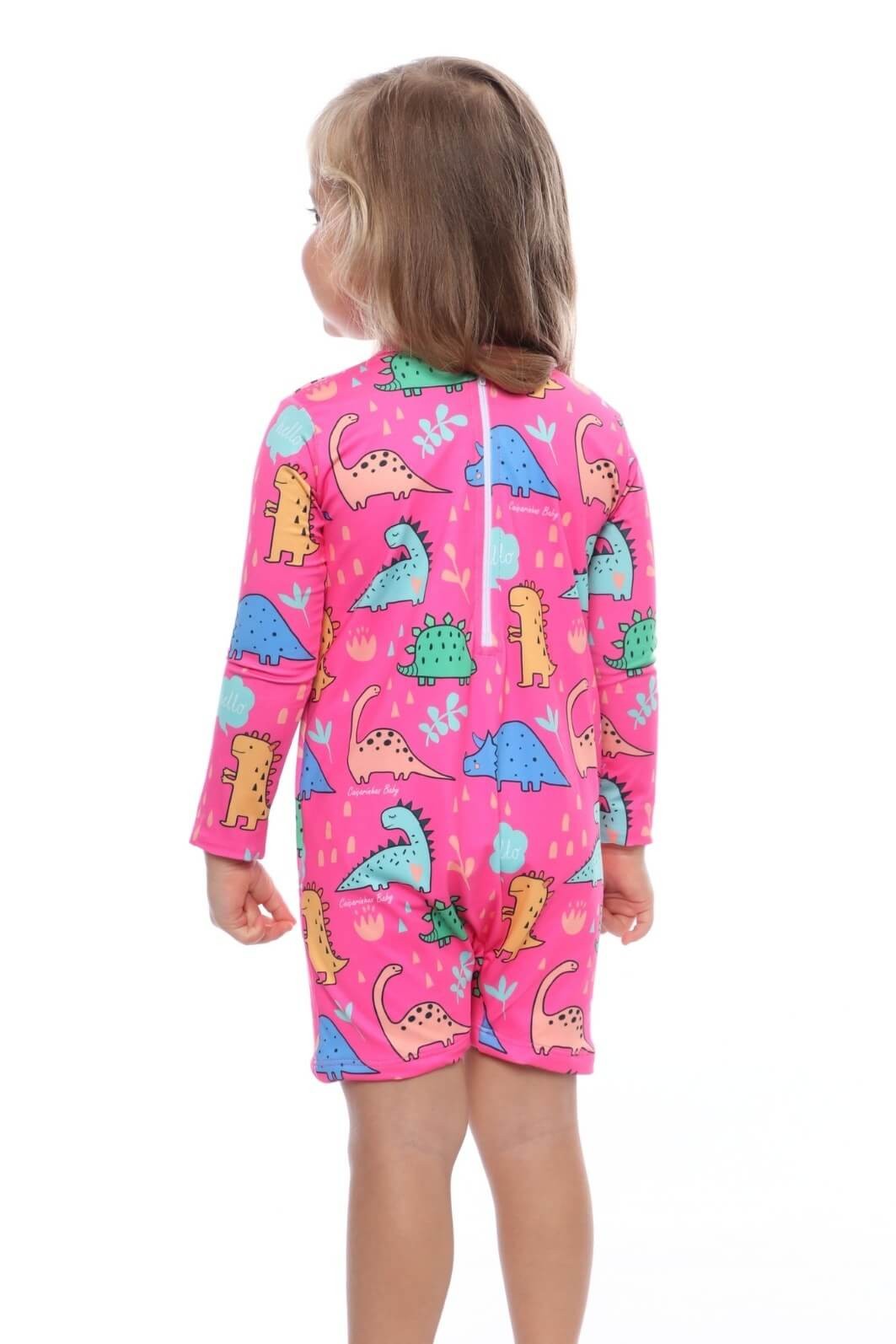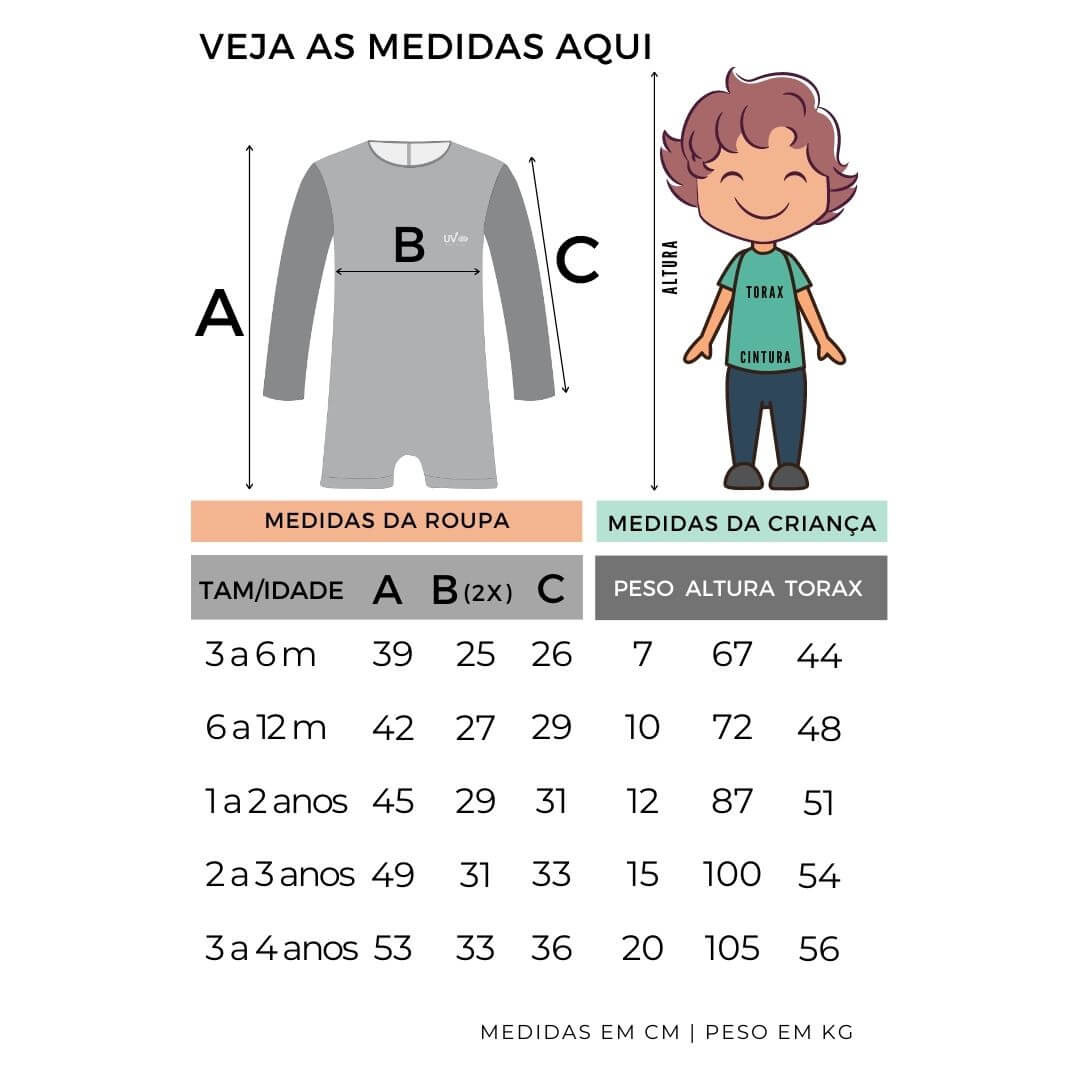 Antes de concluir a compra do macacão praia bebê proteção solar UV 50+ manga longa rosa dino, vale conferir a tabela de medidas e comparar com as medidas atuais da criança.