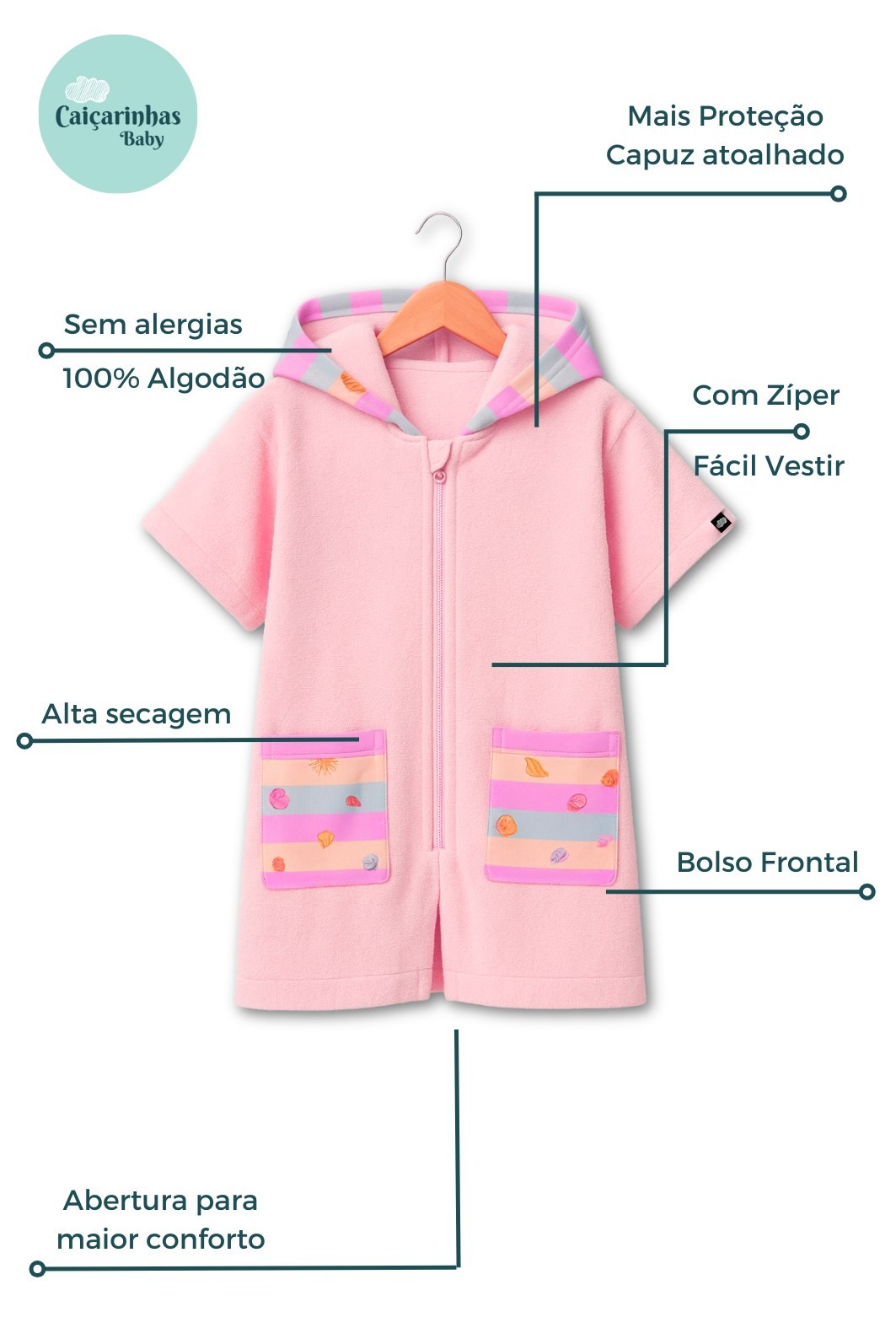 O Roupão Infantil da Caiçarinhas Baby permite que a criança brinque sem que o roupão fique abrindo, pois são feitos de forma que não fiquem caindo ou abrindo toda hora como aqueles convencionais de faixas. Sem contar que o tecido possui alta absorção por ser em 100% algodão.